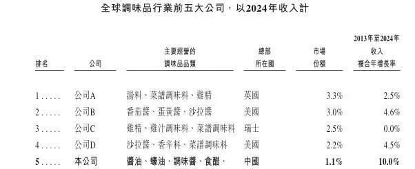 根据弗若斯特沙利文报告,2024年全球调味品市场的规模按收入计算达到了21,438亿元人民币,从2019年至2024年的年复合增长率达到了3.2%。